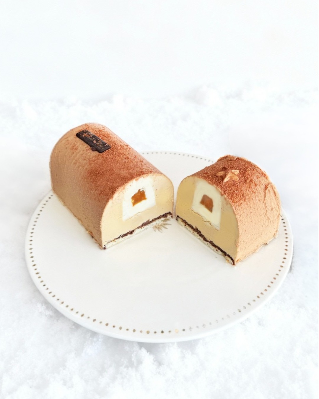 Glace caramel beurre salé, avec insert glace vanille, sur une génoise et un croquant chocolat, cœur fondant caramel beurre salé, enrobage chocolat au lait.